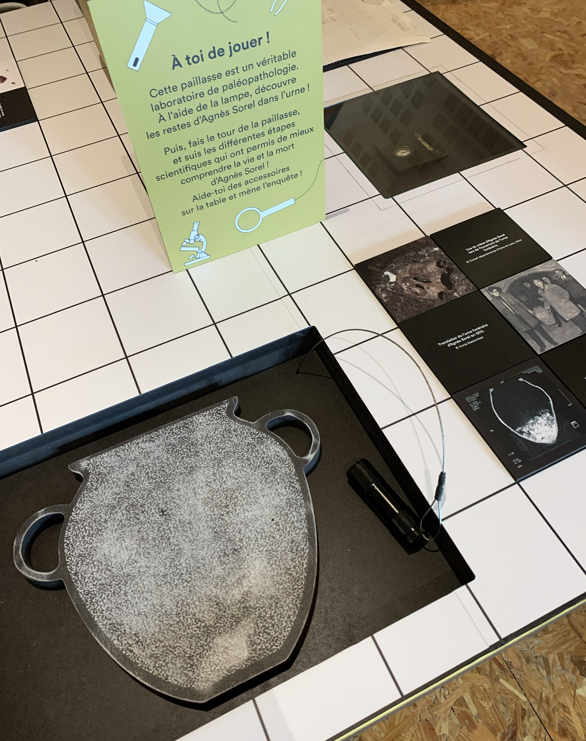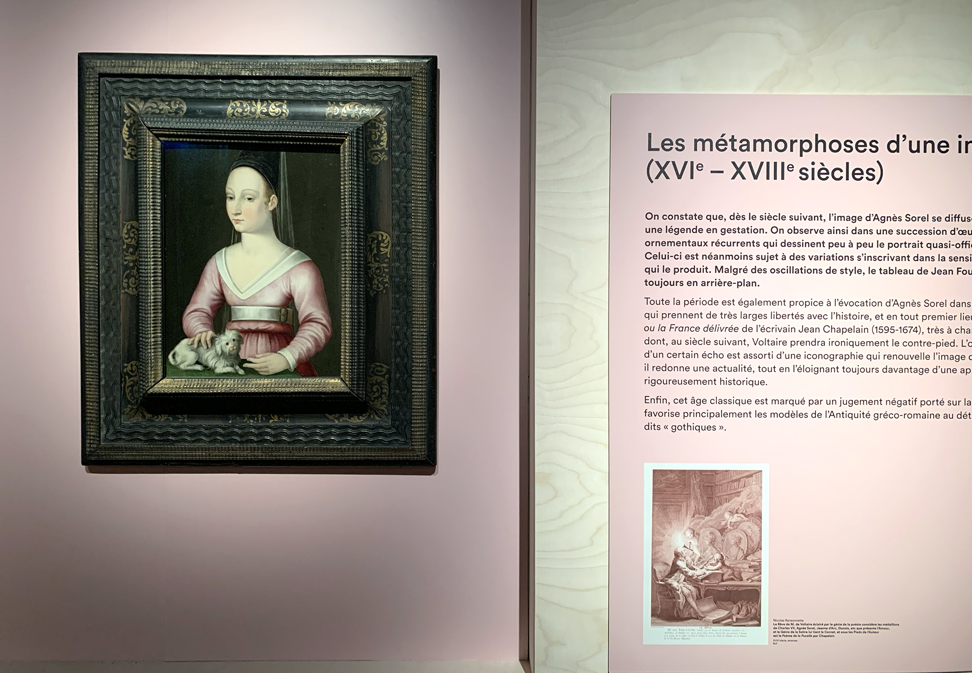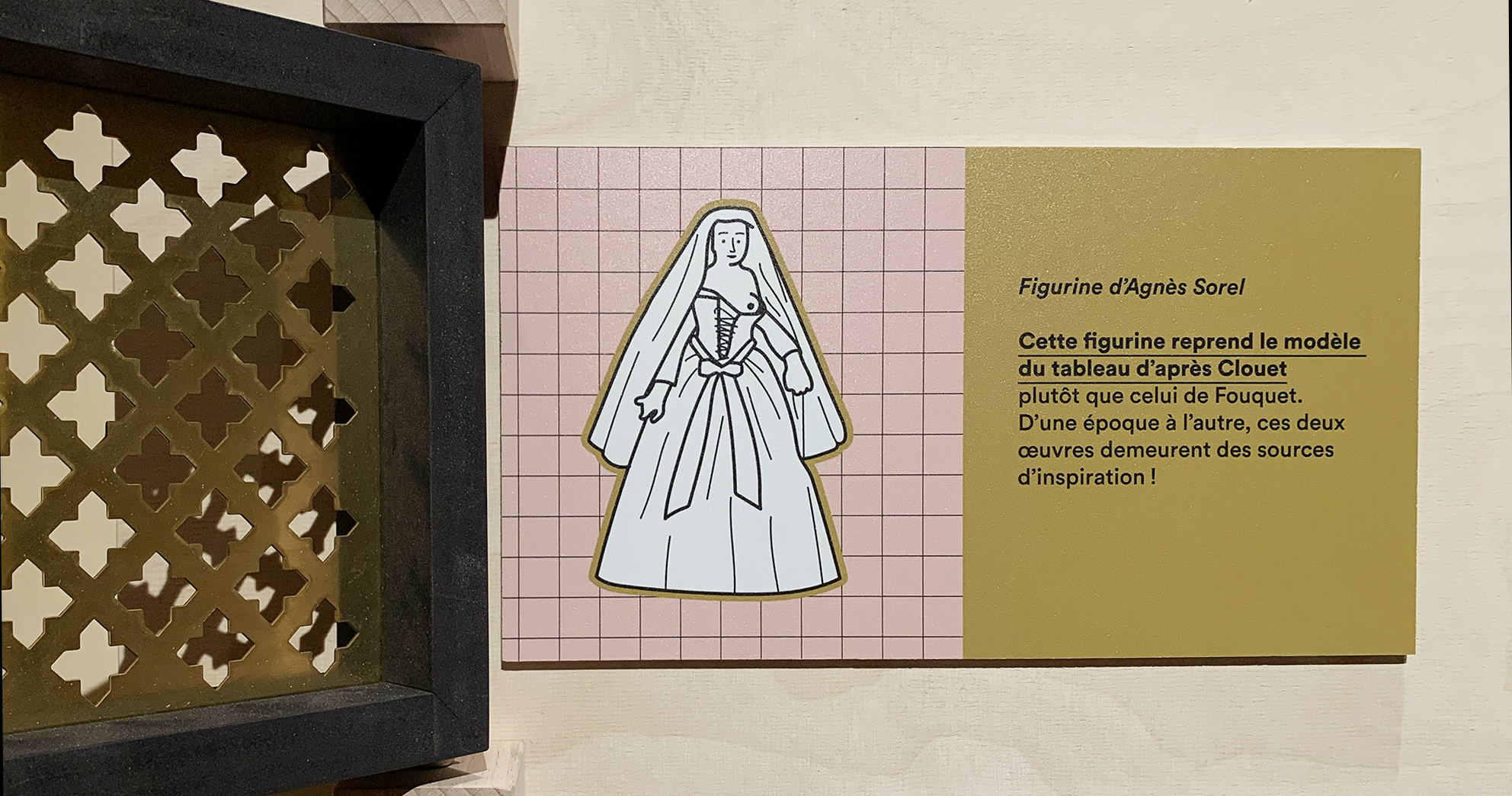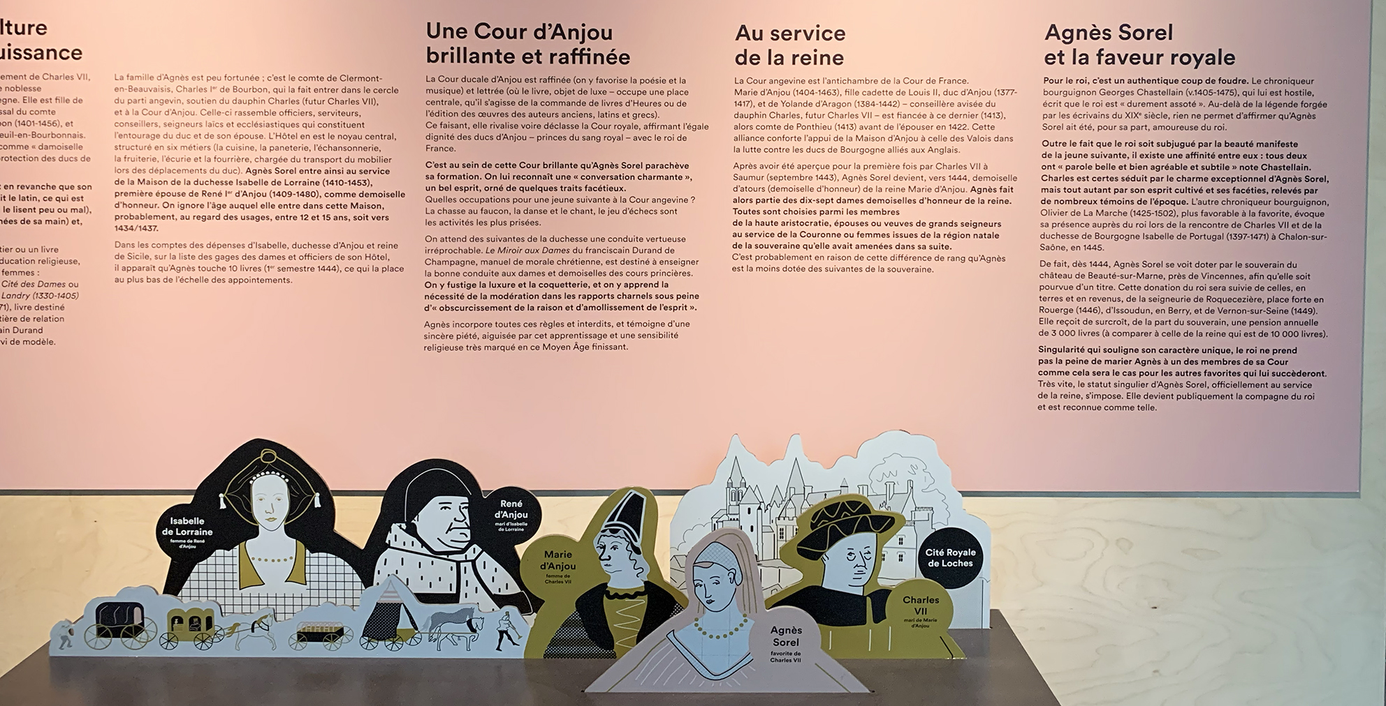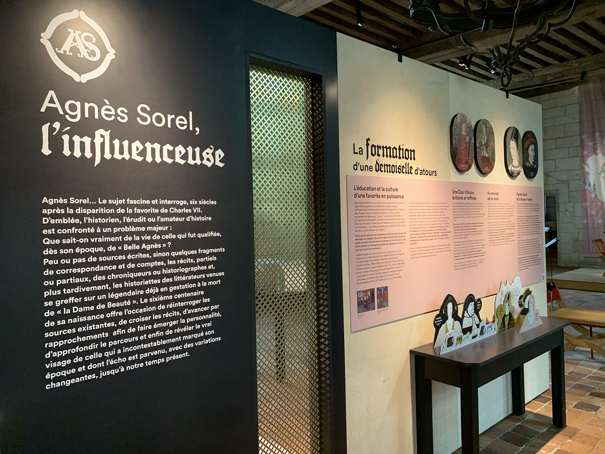 Que sait-on vraiment de la vie de celle qui fut qualifiée, dès son époque, de « Belle Agnès » ? Le sixième centenaire de sa naissance offre l’occasion d’interroger les sources existantes, de croiser les récits afin de faire émerger la personnalité de celle qui a marqué son époque et dont l’écho est parvenu jusqu’à nous. Le graphisme accompagne la scénographie, il aide à l’identification les îlots dédiés à Agnès Sorel dans le parcours permanent. Les illustrations médiévales influencent les illustrations contemporaines et la douce colorimétrie intensifie le propos.