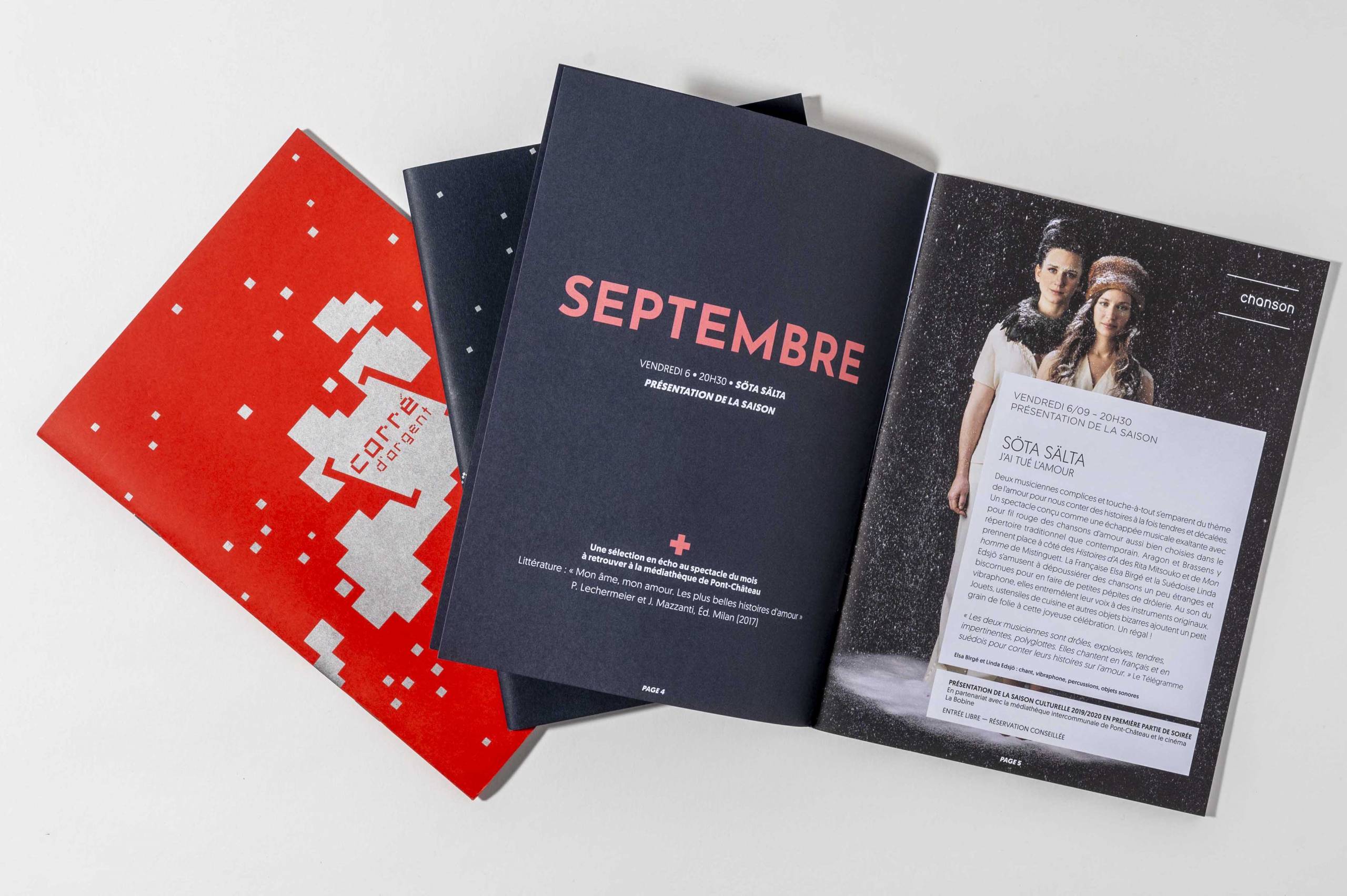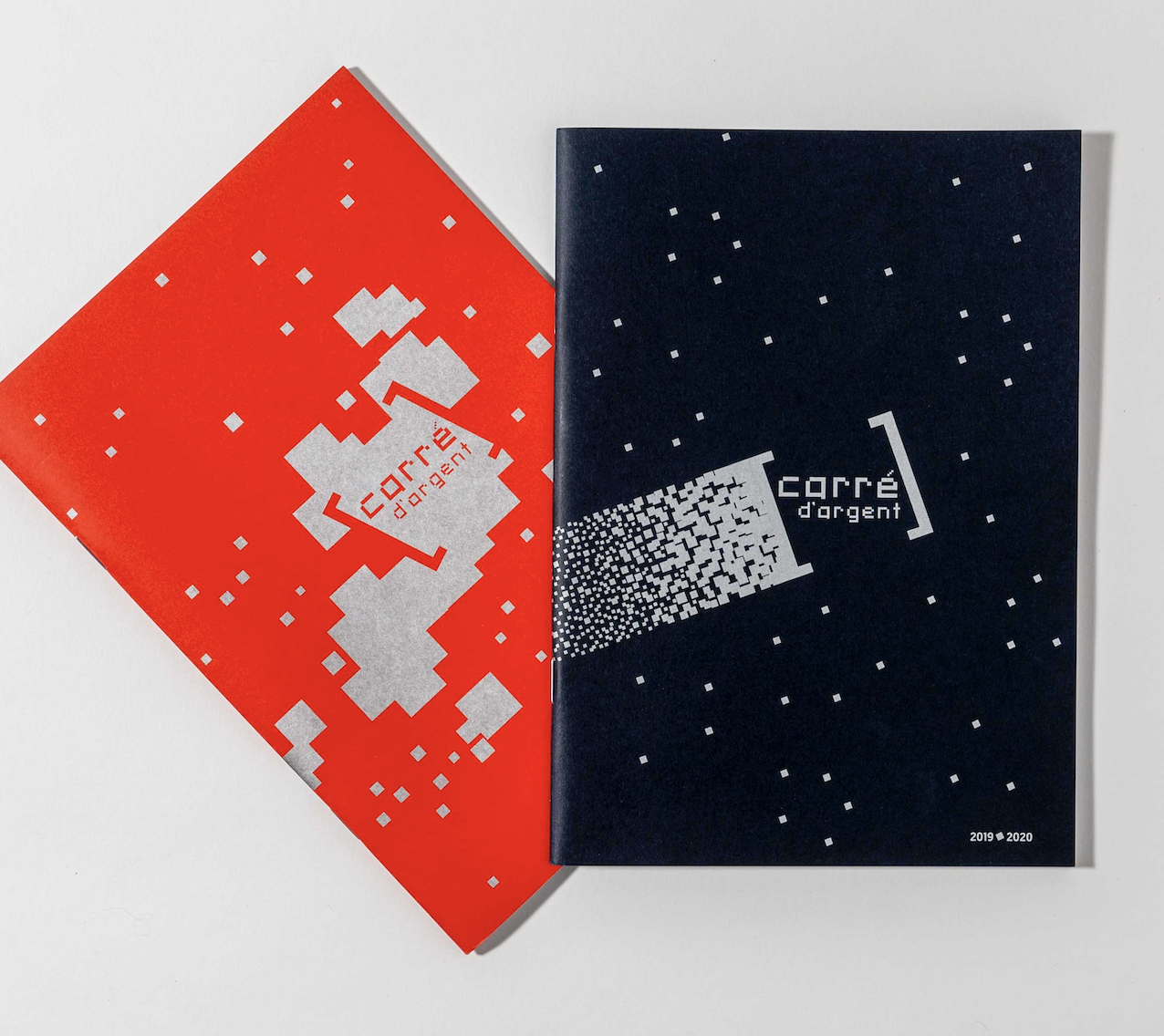 Pendant une douzaine d’année, Nathalie Fonteneau a été en charge de l’identité et de la communication du Carré d’Argent. Ce travail dans la durée, à permit de perfectionner l’univers graphique du théâtre et d’imposer l’image de marque, parmi l’offre culturelle de la région. Il a été décidé en concertation avec la maîtrise d’ouvrage d’utiliser le logotype sur les couvertures et de travailler sur des papiers créatifs, avec des encres particulières. Ces deux constantes ont données un air de famille à toute la communication.