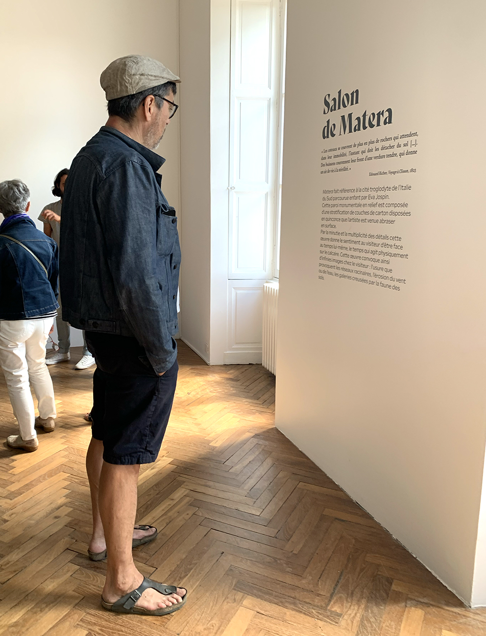 Le Grand Tour d’Eva Jospin nous emmène dans un voyage très personnel où architectures et paysages italiens sont particulièrement présents, « ressouvenirs » – en partie – de son séjour comme pensionnaire à la villa Médicis en 2017. Les textes de séquences et les cartels utilisent une esthétique épurée, à la fois discrète et élégante. Le coffret collector – réalisé en carton, en écho à la matière principale utilisée par l’artiste – contient un leporello pour accueillir une sélection de photos réalisées par Laure Vasconi.