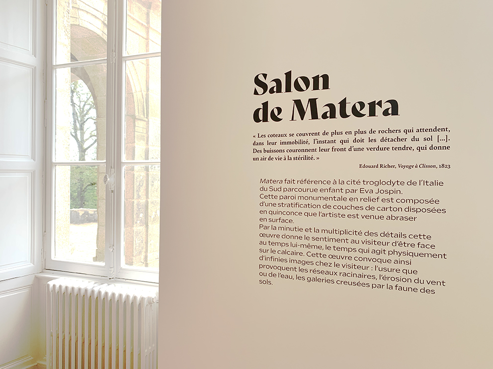 Le Grand Tour d’Eva Jospin nous emmène dans un voyage très personnel où architectures et paysages italiens sont particulièrement présents, « ressouvenirs » – en partie – de son séjour comme pensionnaire à la villa Médicis en 2017. Les textes de séquences et les cartels utilisent une esthétique épurée, à la fois discrète et élégante. Le coffret collector – réalisé en carton, en écho à la matière principale utilisée par l’artiste – contient un leporello pour accueillir une sélection de photos réalisées par Laure Vasconi.