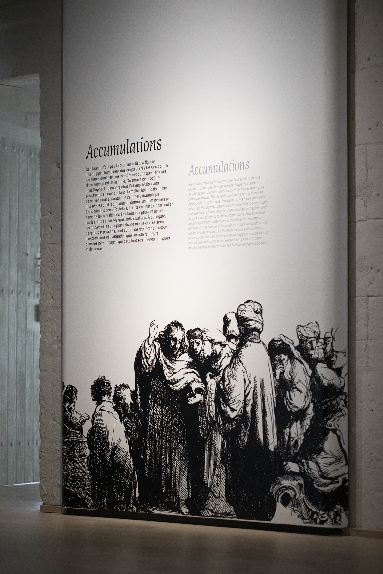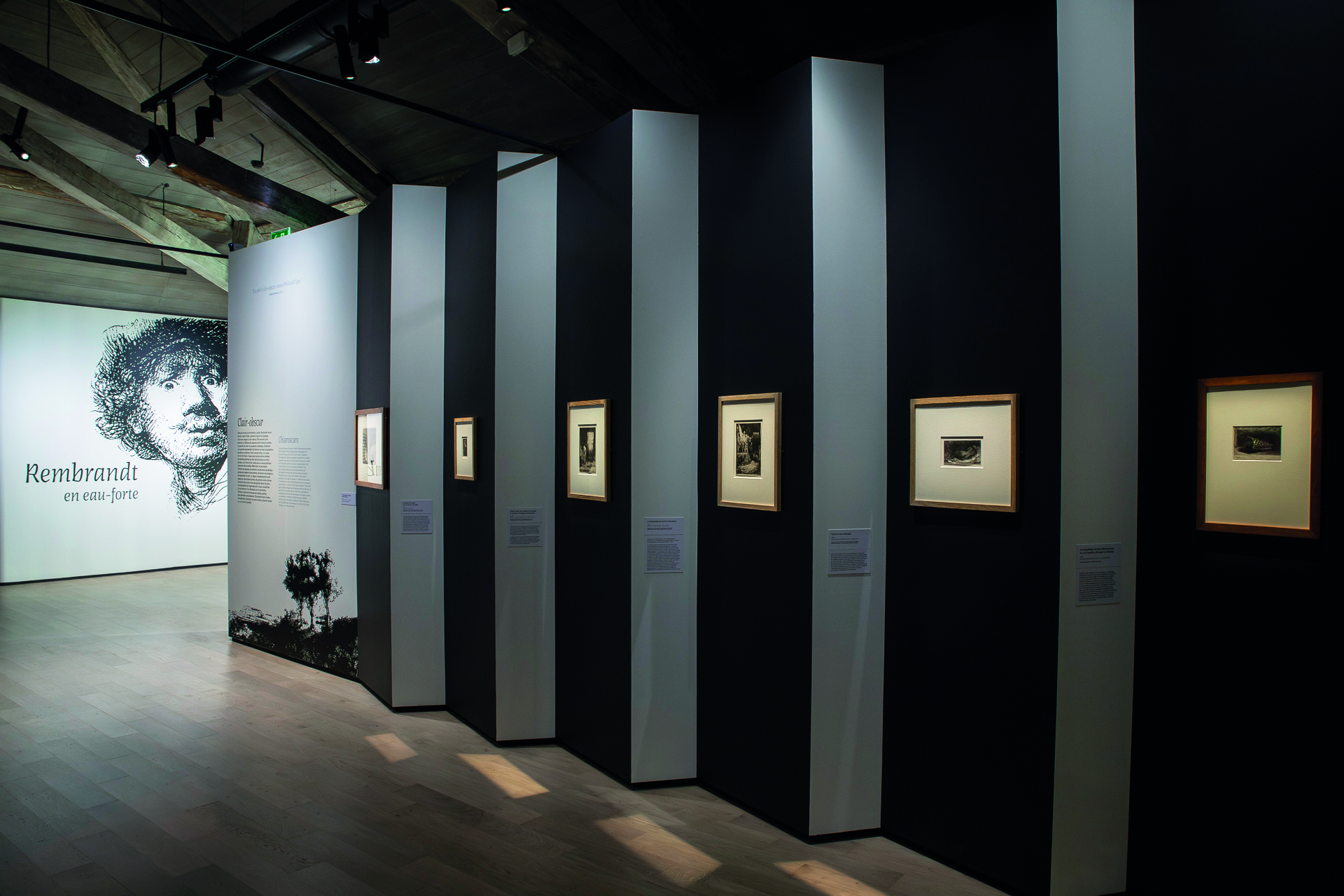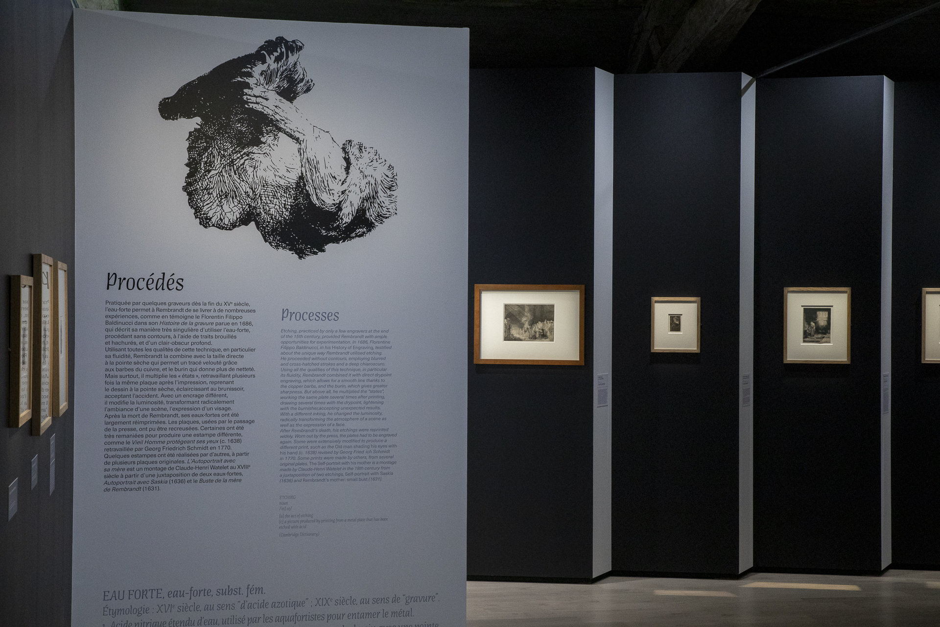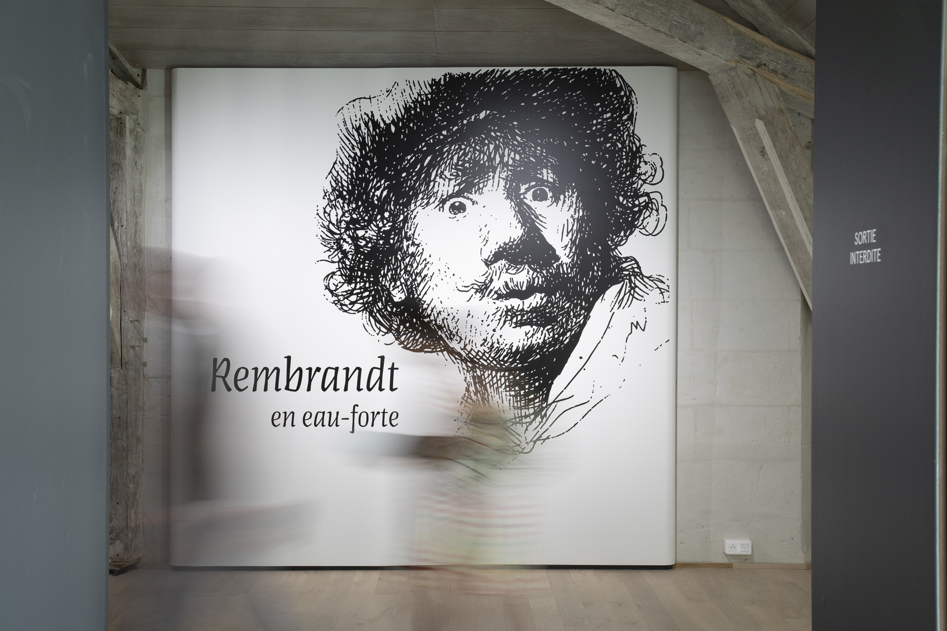 Entre 1628 et 1665, Rembrandt a réalisé plus de trois cents estampes. Ce mode d’expression lui permet de réaliser des compositions originales et d’une grande variété d’effets en fonction des « états », où se conjuguent spontanéité et sens de la construction. Le graphisme accompagne les partis-pris en agrandissant des détails des gravures, pour illustrer les moyens esthétiques et techniques de l’artiste : clair-obscur, accumulation, trouée, traits, hachures…
