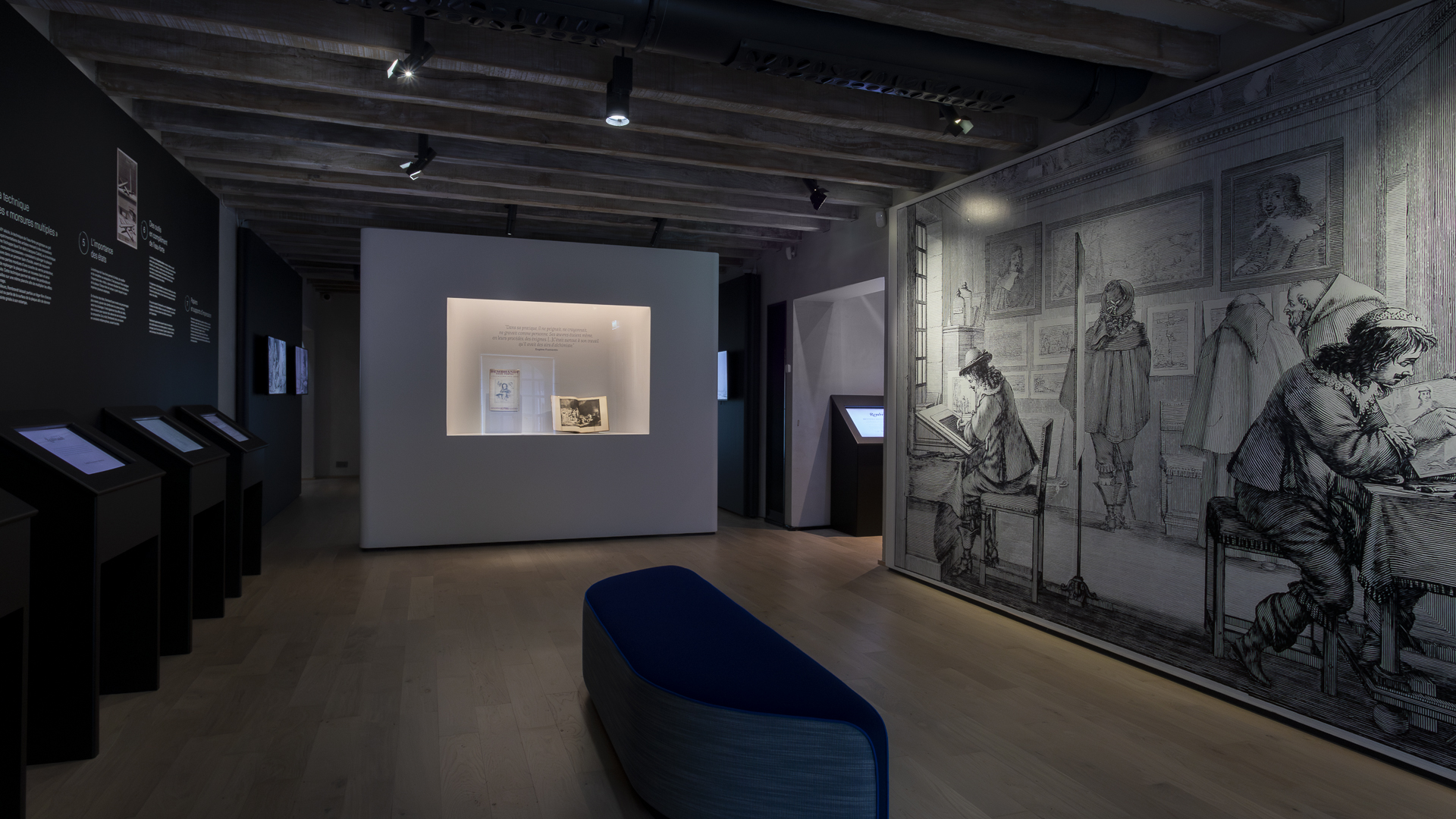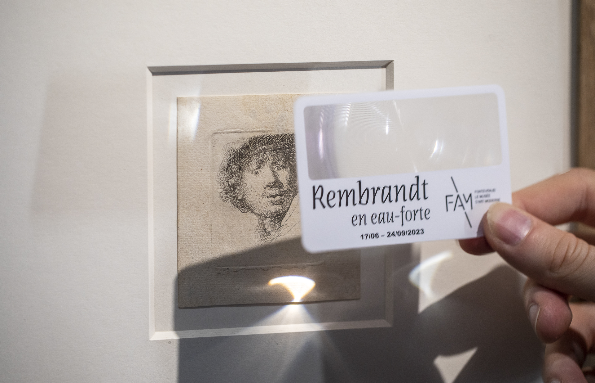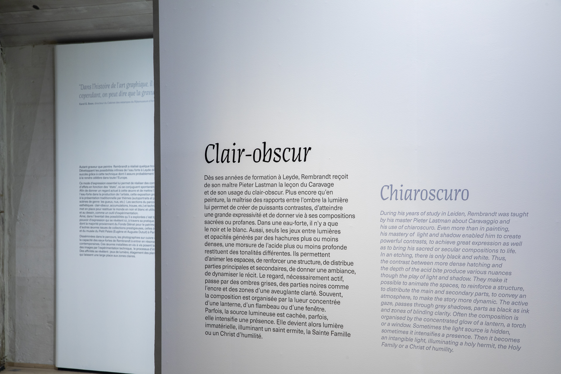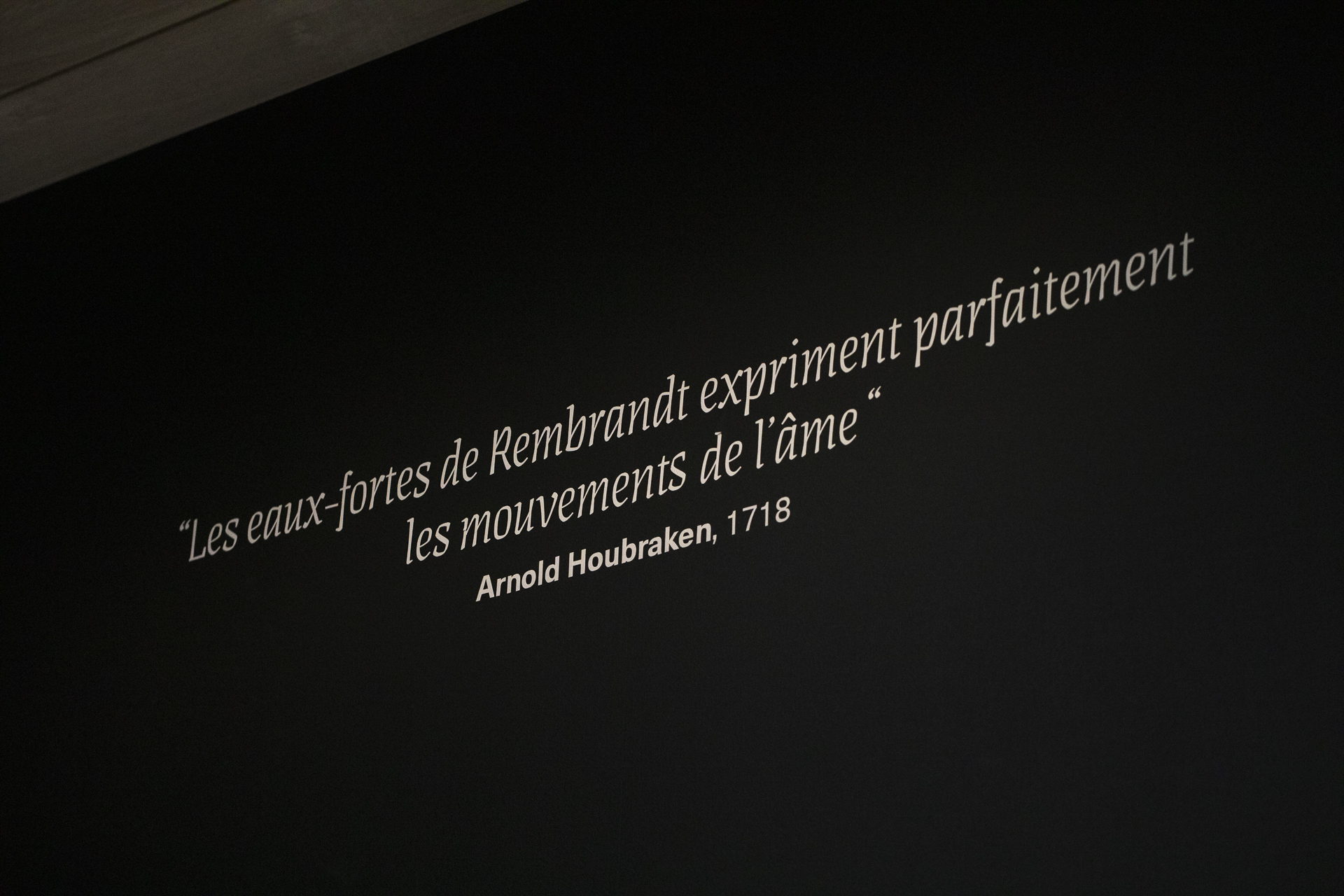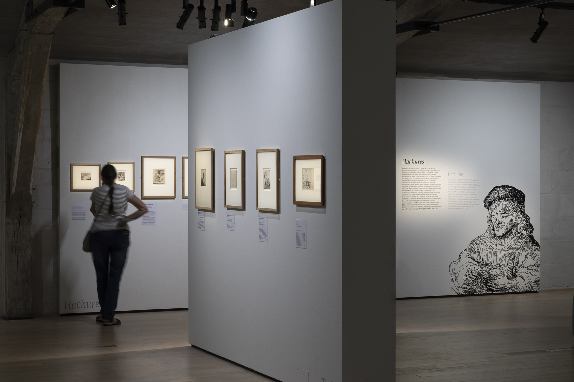 Entre 1628 et 1665, Rembrandt a réalisé plus de trois cents estampes. Ce mode d’expression lui permet de réaliser des compositions originales et d’une grande variété d’effets en fonction des « états », où se conjuguent spontanéité et sens de la construction. Le graphisme accompagne les partis-pris en agrandissant des détails des gravures, pour illustrer les moyens esthétiques et techniques de l’artiste : clair-obscur, accumulation, trouée, traits, hachures…