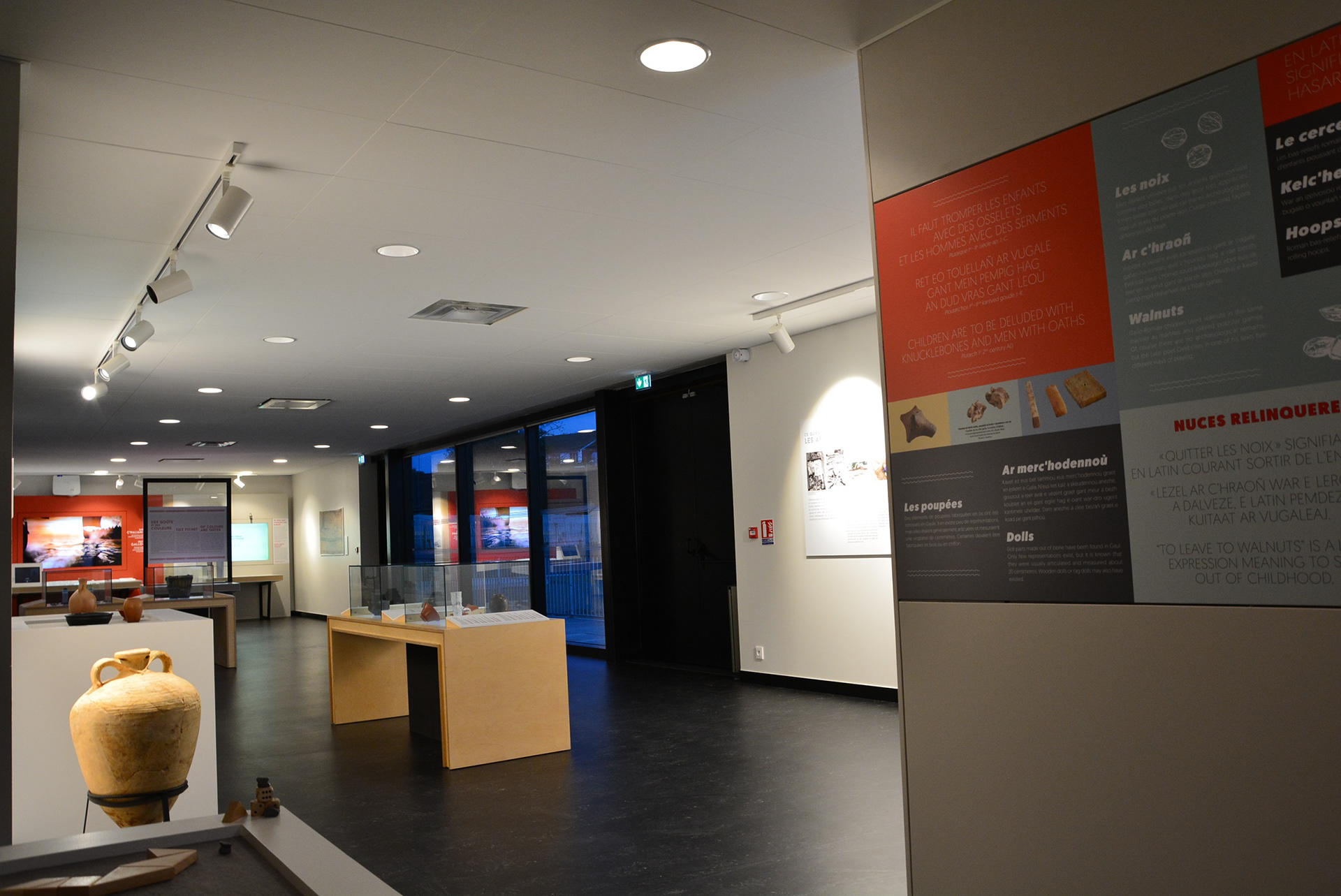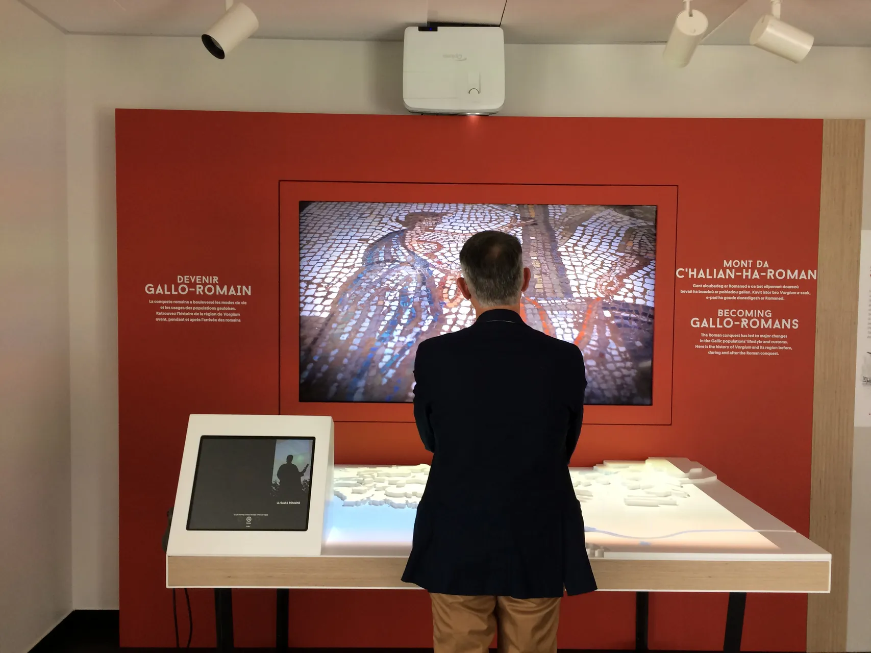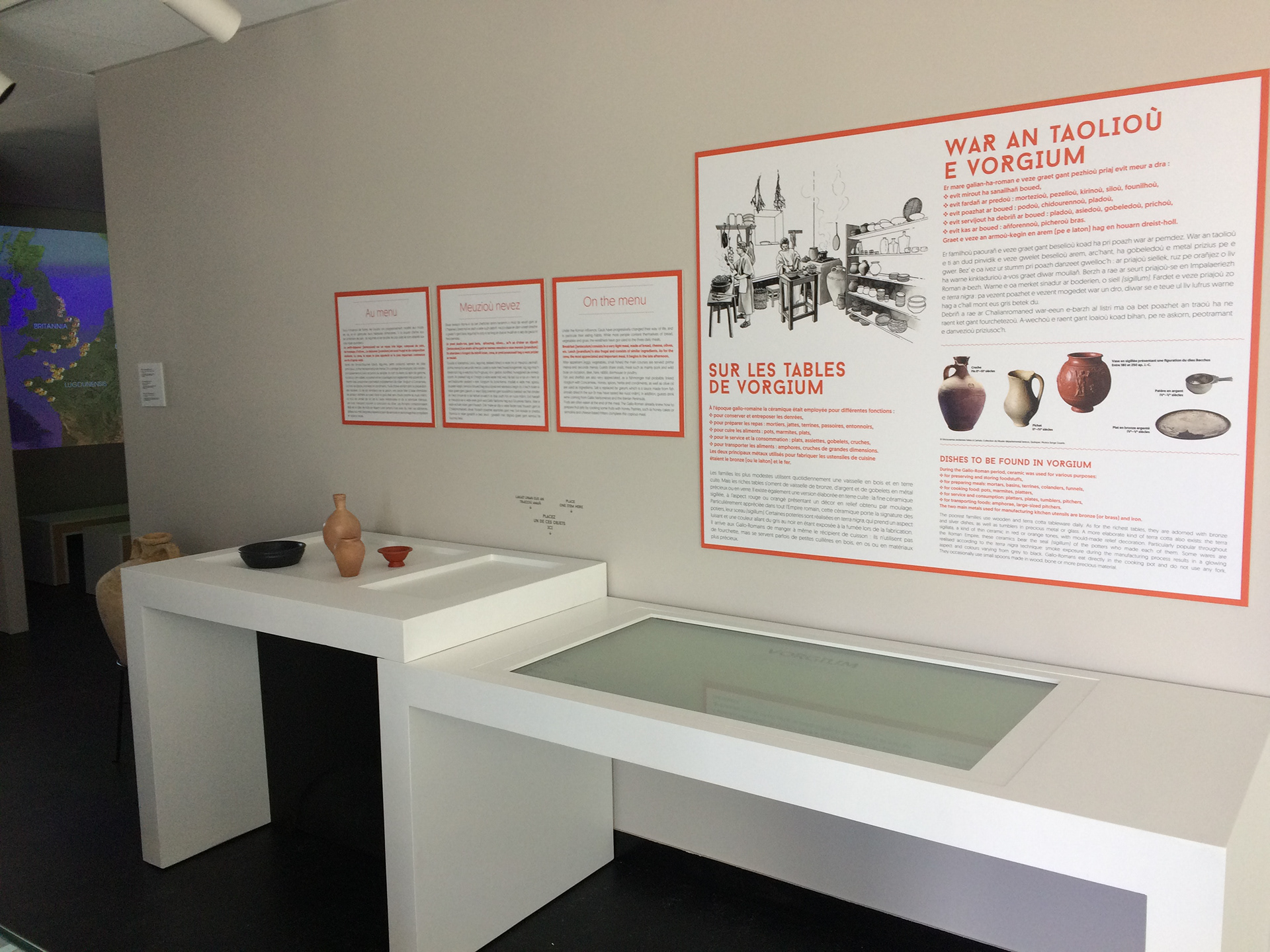 Dans le site d’interprétation, des bornes multimédia, des vitrines et des jeux permettent de découvrir l’importance de la ville de Vorgium (l’actuelle Carhaix), fondée au 1er siècle avant notre ère. Les différents aspects de la vie quotidienne gallo-romaine y sont évoqués, pour proposer une visite interactive et accessible à tous. Le design graphique se met au service des contenus pour les rendre accessibles.
